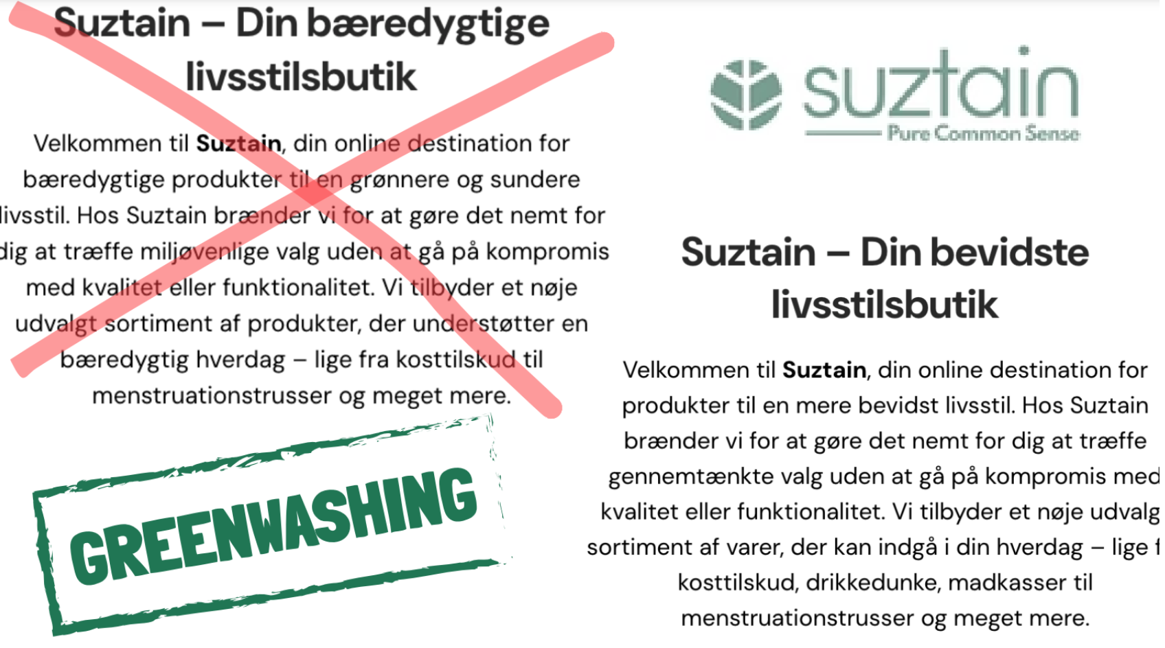 Virksomheden Suztain har ændret mange af deres produktbeskrivelser, efter Sustain Report afdækkede den åbenlyse og systematiske greenwashing. Collage: Stine Amalie Helmo Kisling.